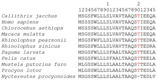 Multiple sequence alignment of 11 mammalian ACE2 proteins. Only 25 amino acid sites from the N-terminus are shown, taken from Wei et al. [14].