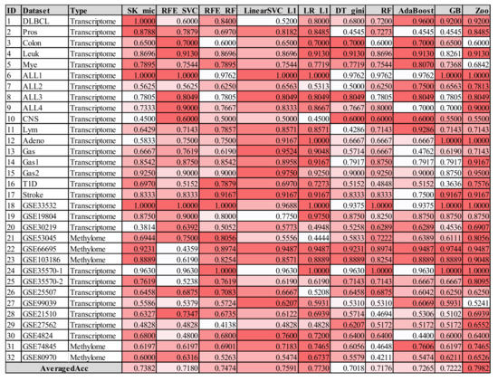 APA StyleHan, Y., Huang, L., & Zhou, F. (2021). Zoo: Selecting Transcriptomic and Methylomic Biomarkers by Ensembling Animal-Inspired Swarm Intelligence Feature Selection Algorithms. Genes, 12(11), 1814. https://doi.org/10.3390/genes12111814