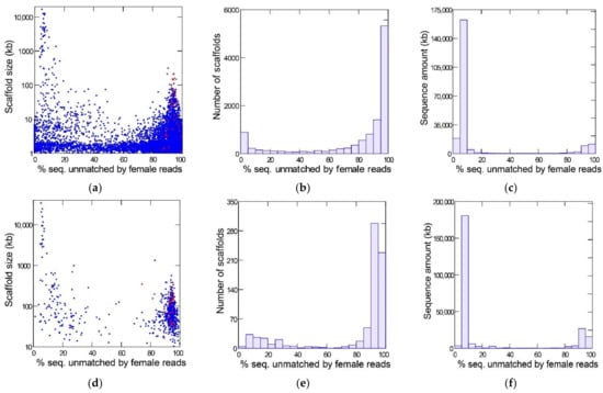 Figure 1 shows the results of the YGS method as applied to the reference Sanger assembly (top row) and a PacBio assembly (bottom row) of the same strain of D. willistoni. The bimodal distribution separates the Y-linked sequences (peak on the right-hand, with a large amount of sequence unmatched by female reads) from the X and autosomes (left-hand peak). The red dots mark the scaffolds matching the eight previously known Y-linked genes of D. willistoni [,]. All these sequences are located in the right-hand peak (average for Sanger assembly: 94%; range: 87–100%); they served as a positive control and show that the YGS method reliably identifies Y-linked sequences in D. willistoni. In the intermediate region of the graph, between the two peaks, there are numerous small sequences in the Sanger assembly; they correspond to misassembled repetitive regions []. YGS results are usually presented as in the first two columns of Figure 1, which may mislead the reader to conclude that Y-linked sequences represent a large proportion of the genome. The last column, which shows the amount of sequence in the scaffolds, clarifies that the Y chromosome is relatively small; because it is a repeat-rich region, Y-linked sequences are prone to assembly fragmentation and tend to get scattered in numerous small scaffolds. If we adopt the cut-off of 60% unmatched sequences, we find that the Y-chromosome in the Sanger assembly contains 28.5 Mbp (in 9031 scaffolds), whereas the X and autosomes amount to 189.8 Mbp (in 2107 scaffolds); the corresponding values for the PacBio assembly are 49.4 Mbp (in 605 scaffolds) and 197.6 Mbp (in 139 scaffolds). As suggested by the sharp bimodality shown in Figure 1 (panels c and f), the above estimates are quite robust in relation to the 60% cutoff; adopting an 80% cut-off would reduce the estimated size of the Y chromosome to 26.7 Mbp (Sanger assembly) and 48.6 Mbp (PacBio assembly). PacBio assemblies tend to be larger because they have a better representation of repetitive sequences; note that assembled size of the Y chromosome (being repeat-rich) increased much more than that of the X and autosomes. Another advantage of PacBio and Nanopore assemblies compared to Sanger or Illumina is that they are much less fragmented: the Sanger assembly contains 14,838 scaffolds, the PacBio contains 748, and the Nanopore contains 336. The smaller fragmentation helps the identification of Y-linked scaffolds: in the Sanger assembly, 3700 scaffolds, amounting to 5.3 Mbp, could not be classified by the YGS method because they are not informative (contain less than 20 valid single-copy k-mers; []); the corresponding figures for the PacBio assembly are four scaffolds and 71 kb. Despite these advantages, we will use the Sanger assembly in most analyses because it is the reference assembly.