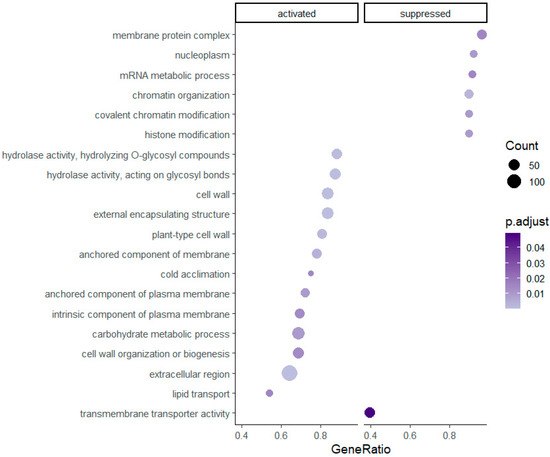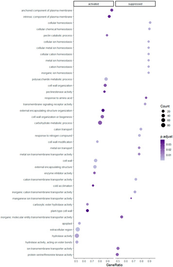 ClusterProfiler v.4.0.2 [113] was used for Gene Set Enrichment Analysis. This package currently only accepts single organism references via AnnotationDbi v.1.55.1 [114]. Of the currently accepted reference genomes, A. thaliana is most closely related to R. kuepferi [115]. Consequently, the pseudoreference was annotated again as described above using the updated TAIR 10 release [The Arabidopsis Information Resource (TAIR), http://www.arabidopsis.org; accessed on 11 March 2021] and the resulting annotations were employed in ClusterProfiler for a separate run for each cytotype, checking all subontologies and with several 1 Mio. permutations. For these analyses, the warm treatment was set as the control condition. Dot plots were generated with enrichplot v.1.13.1 [116].