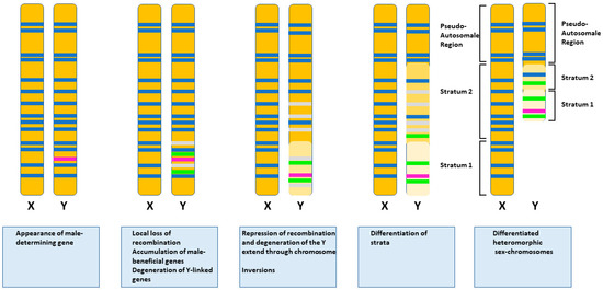 Current model for evolution of heteromorphic sex chromosomes from a pair of autosomes. Steps are shown from left to right. Ancestral genes are represented by dark blue lines, the male-determining gene is represented by a pink line, male beneficial genes are represented by green lines, and degenerating genes are represented by grey lines. Faded colours in the chromosome show the appearance of strata.