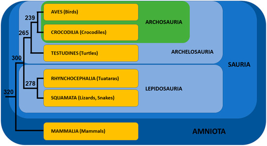The phylogenetic position of Turtles among Reptiles (=Sauria) had been a matter of controversy for a long time (see [31] for review), but the development of molecular phylogenetics clarified the situation at the beginning of the century. Molecular studies using ultraconserved elements [32], mitochondrial and nuclear genes [33,34], and finally the sequences of three turtle genomes [35,36] led to the consensus that turtles (=Testudines) are the sister-group of Archosauria (=Birds + Crocodilians). Together, they form Archelosauria [37], the sister group of Lepidosauria (=Tuatara + Lizards + Snakes) (Figure 2).