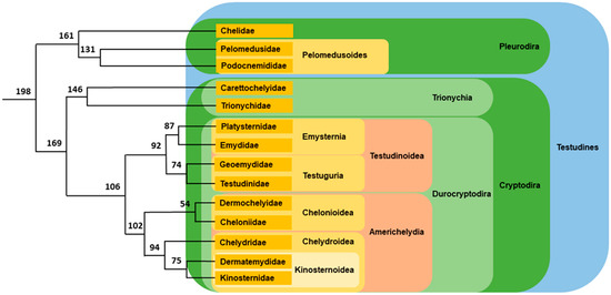 Phylogenomic analyses highlighted the evolutionary history and relative phylogenetic relationships among turtle families [37,39,40,41]. The first division occurred in the early Jurassic period. It separated the suborder Pleurodira, or side-necked turtles, that originated in Gondwana from the suborder Cryptodira, or hidden-necked turtles, with a northern origin located in Laurasia. Pleurodira contains three families, all distributed in the southern hemisphere. Cryptodira is divided into Trionychia, soft-shelled turtles, itself with two families, and Durocryptodira with nine families dispatched in two clades, Testudinoidea and Americhelydia (Figure 3). This phylogenetic tree is robust and widely accepted. In almost each family, the relative position of the different genera and even those of the different species is now well established.