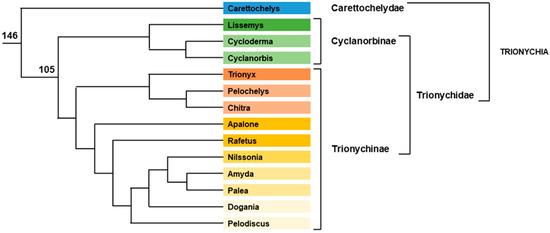 Phylogenic tree of trionychid turtles. Relative position of each genus and superior clade are represented. Branch lengths are not proportional to time. Numbers indicate divergence time (Myrs) from present for some key nodes, according to [39]. Color of each genus indicates the different clades.