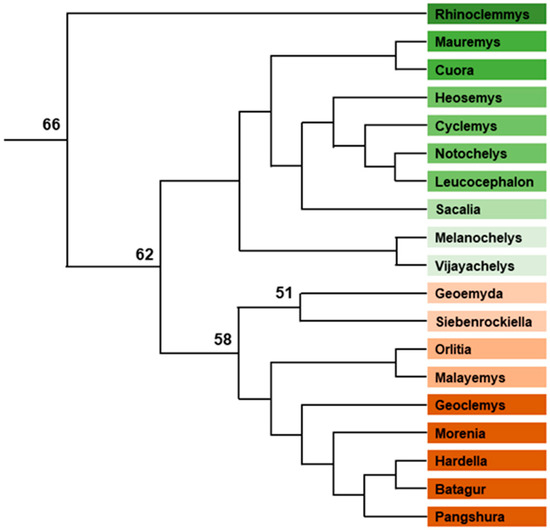 Phylogenic tree of geoemydid turtles. Relative position of each genus and superior clade are represented. Branch lengths are not proportional to time. Numbers indicate divergence time (Myrs) from the present for some key nodes, according to [39]. Color of each genus indicates the different clades.