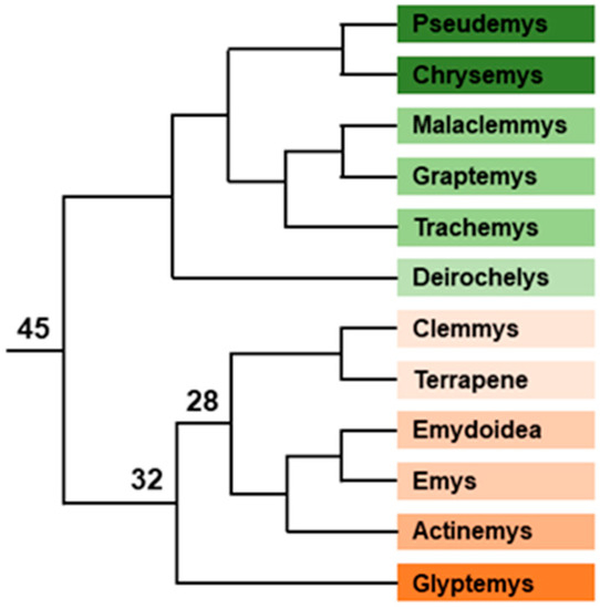 Phylogenic tree of emydid turtles. Relative position of each genus and superior clade are represented. Branch lengths are not proportional to time. Numbers indicate divergence time (Myrs) from present for some key nodes, according to [39]. Color of each genus indicates the different clades.