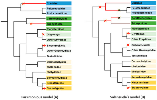 Overall, five different GSD systems exist in turtles. When looking at their phylogenetic distribution, the intuitive, simplest, and most parsimonious hypothesis is that these five systems arose independently from TSD (Figure 8A). Unexpectedly, the laboratory of N. Valenzuela published another model [50]. Using maximum likelihood procedures, they claimed that the transitions from TSD to GSD leading to GSD in Chelidae and Trionychidae were very old and occurred before they split from Pelomedusoides and Carettochelyidae, respectively. Accordingly, they postulated two putative transitions from GSD to TSD in both Carettochelyidae and the common ancestor of Pelomedusoides (Figure 8B). Moreover, the study of the rate of molecular evolution of genes implicated in sex-determination gave some support to this hypothesis [163]. If true, this model implies two testable consequences. Firstly, as recently pointed out by [164], it means that TSD in both Pelomedusoides and Carettochelyidae is a derived state and therefore not homologous to TSD in other turtles. Consequently, we expect a different mechanism for TSD in these families compared to other turtles. The deciphering of the mechanisms of TSD in reptiles has made tremendous advances recently [165,166,167]. In the turtle Trachemys scripta elegans, the key factor is Lysine Demethylase 6B (KDM6B or JMJD3), which promotes the male pathway by activating the male sex-determining gene Dmrt1 [166]. At female-producing temperature, likely in response to a rise in Ca2+ levels, Stat3, Signal Transducer and Activator of Transcription 3, is phosphorylated and transcriptionally represses expression of KDM6B, pushing the gonad towards a female phenotype [167]. If such a mechanism were also active in Pelomedusoides and Carettochelyidae, this would not be in favor of Valenzuela’s model. Secondly, this model entails that, for example in Pelomedusoides, the autosome homologous to the X chromosome of Chelidae was an X chromosome during the interval between the two transitions of sex-determining mechanisms. Unlike autosomes, an X chromosome spends more time in females than in males. Because gametes experience fewer division cycles in ovary than in testis, mutations occur at a slower rate in females compared to males. Therefore, an X chromosome accumulates fewer mutations than an autosome, as documented in mammals [168]. So, if Valenzuela’s model is right, by comparing the substitution rate of X-linked Chelids genes with their autosomal orthologs both in Pelomedusoides and in an outgroup (some TSD cryptodirian species as C. picta for instance), one would expect a slower rate in Chelids and an intermediate rate in Pelomedusoides compared to outgroup species. The same type of reasoning can be made for the Z chromosome genes of Trionychidae and its orthologs in Carettochelyidae and a TSD Durocryptodirian outgroup, with the only difference being that the Z chromosome accumulates more mutations than autosomes. Of course, such analyses will require whole genome sequences of Carettochelys and Chelids, Pelomedusoides and Trionychids species, which are not yet available. However, with the growing number of available genomes, it will soon be possible to test Valuenzela’s model.