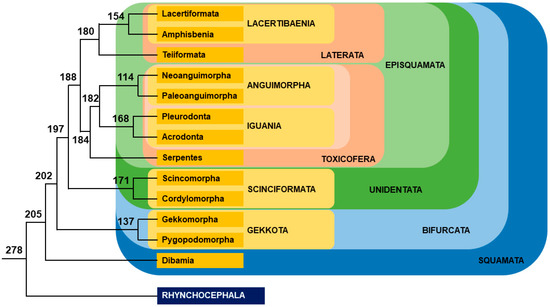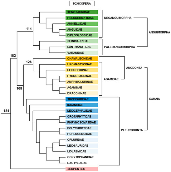 Phylogenic tree of squamates. Relative positions of each clade are represented following [38]. Names of clades are according to [170]. This tree has strong support, except for the position of Dibamia, which is sometimes alternatively placed as the sister group of Gekkota [171]. Branch lengths are not proportional to time. Numbers indicate divergence time (Myrs) from present for nodes, according to [38]. Colors indicate the different level of clades in the phylogenetic tree.