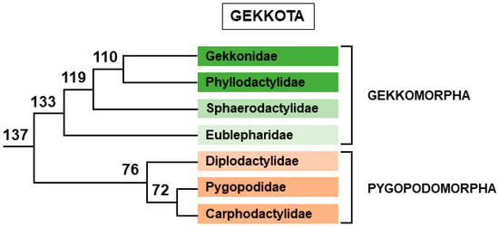 Phylogenic tree of Gekkota. Relative positions of each family are represented. Branch lengths are not proportional to time. Numbers indicate divergence time (Myrs) from present for nodes, according to [38]. Color of each family indicates the different clades.