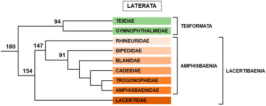 Laterata are divided between Teiiformata with two families, Teiidae (171 species) and Gymnophthalmidae (270 species), and Lacertibaenia, composed of Amphisbenia (6 families, 203 species) on one side, and a single family, Lacertidae (354 species) on the other side (Figure 12).