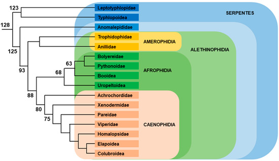 Phylogenic tree of Toxicofera. Relative positions of each family and superior clade are represented. Branch lengths are not proportional to time. Numbers indicate divergence time (Myrs) from present for nodes, according to [38]. Color of each family or subfamily indicates the different clades.