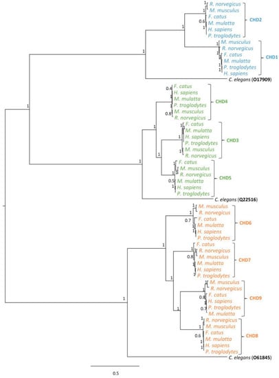 The phylogenetic analysis of CHD proteins considering the six mammalian species under investigation (Figure 1) showed that CHDs cluster in three clades that match the three groups of proteins from the CHD family based on the types of functional domains: I (CHD1 and CHD2), II (CHD3, CHD4, and CHD5), and III (CHD6, CHD7, CHD8, and CHD9). According to Flanagan and colleagues [51], each group of CHDs derived from one of three different ancestral proteins. In line with this and taking into account the position of the sequences from C. elegans, our analysis suggests that at least three ancestral CHDs existed before the divergence of vertebrates [6,51], an indication that the expansion of the CHD gene family by gene duplication events occurred after the divergence between invertebrates and vertebrates. Flanagan and colleagues [51] further showed that invertebrates, vertebrates and plants have three CHD classes whereas some unicellular organisms have one CHD group. As such, the question can be raised on whether the proliferation of different paralogues for CHD proteins might have occurred in the transition from unicellular to multicellular organisms due to the demanding needs of specialized functions that emerged with multicellularity [64,65,66]. The phylogenetic topology for group III CHDs shows that CHD6 places basally to CHD7, CHD8, and CHD9, indicating that the CHD6 sequence is more divergent than CHD7, CHD8, or CHD9. This result is consistent with those provided by the biochemical studies of Manning and Yusufzai [7] which suggest that CHD6 lacks nucleosome sliding activity and might have a different mechanism to disrupt chromatin, in contrast to other group III CHDs.