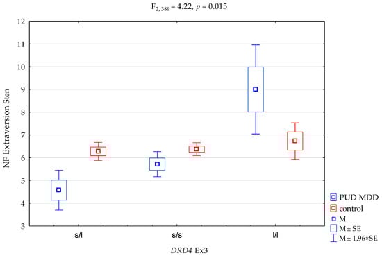 This protective effect of the l alleles may be found in our post hoc analysis (Table 7). While in the PUDD MDD group, the mean sten score on the Extraversion Scale was 5.44 (Table 5), in the PUD MDD DRD4 exon 3 (Ex3) l/l group, it was 9.0 (Table 7). The same happened for the Conscientiousness Scale: the mean sten score in the PUDD MDD group was 5.01, and in the PUD MDD DRD4 exon 3 (Ex3) l/l group, it was 9.5. This effect is presented in Figure 1 and Figure 2. While examining interactions in the subjects with the DRD4 exon 3 (Ex3) s/l polymorphism, a lower level of extraversion (sten scores) was found compared to the control group with the DRD4 exon 3 (Ex3) s/l polymorphism. In contrast, an inverse correlation occurs for interactions in individuals with the DRD4 exon 3 (Ex3) l/l polymorphism in the level of extraversion (for genotypic correlations in the control group, that level of extraversion did not change—as shown in Figure 1, no additive control + genetic polymorphism effect was found).