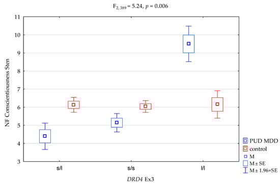 For interactions in the subjects (patients with polysubstance use disorder comorbid with a depressive episode) with the DRD4 exon 3 (Ex3) s/l polymorphism, a lower level of conscientiousness (sten scores) may be found compared to the control group with the DRD4 exon 3 (Ex3) s/l polymorphism (4.39 vs. 6.13). In contrast, an inverse correlation occurs for interactions in the subjects with the DRD4 exon 3 (Ex3) l/l polymorphism. Their level of conscientiousness (sten scores) is higher than in the control group with the DRD4 exon 3 (Ex3) l/l polymorphism (9.5 vs. 6.15; F2,389 = 5.24, p = 0.006). Furthermore, the level of conscientiousness in the control group did not change depending on the variant of the DRD4 exon 3 (Ex3) s/l polymorphism (no additive control + genetic polymorphism effect was found) (Figure 2).