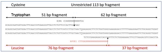 Characteristic of the dPACS procedure, the primers encompassed the whole region to be amplified except for the three nucleotides of the 2027 codon. The primers and restriction enzymes were selected using the dPACS freeware (http://opendata.syngenta.agroknow.com/models/dpacs, accessed on 3 July 2021). Both forward and reverse primers were 55 bp in length and the diagnostic restriction enzymes were XcmI and BpuEI for the wild-type tryptophan and mutant leucine alleles, respectively (Figure 2). The forward primer (5′GCAGGCAATGATGGACTTCAACCGTGAAGGGTTACCTCTGTTCCCACTTGCTAAC3′) required three forced nucleotide changes at N-11, N-12, and N-13 (underlined) with respect to the second variable base of the 2027 codon to allow digestion with XcmI (recognition site CCANNNNNNNNNTGG) and to positively identify the wild-type tryptophan allele (TGG triplet). The reverse primer (5′ ATCCAGCCTGCAGAATTCCTTCAAAAAGGTCTCTTTGCCCACCAGAGAAGCCTCT 3′) completely matched the template ACCase DNA. Restriction with BpuEI (recognition site CTTGAGNNNNNNNNNNNNNNNN) enzyme only occurs in the presence of the mutant leucine allele (TTG triplet). Digestion of the wild-type tryptophan allele with XcmI would result in two shorter fragments of 51 and 62 base pairs whilst restriction of the mutant leucine allele with BpuEI would generate two fragments of 37 and 76 base pairs (Figure 2). The absence of either tryptophan or leucine allele at ACCase codon position 2027 would result in an undigested band of 113 bp.