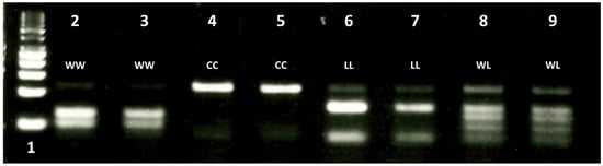 A derived Polymorphic Cleaved Sequence (dPACS) assay was established for the cost-effective genotyping of resistance mutations at ACCase codon 2027 in L. multiflorum []. All three relevant known codon triplets at position 2027 were taken into consideration: namely, TGG, TTG, and TGT, which code for wild-type tryptophan and mutant leucine and mutant cysteine in the species. A large number of potential primer/enzyme combinations was generated by the dPACS software, including MfeI and PvuII with two forced mutations on the forward primer for detecting the wild-type tryptophan allele, and HindIII and TaqII for identifying the mutant leucine allele with two other mismatches on the forward and reverse primers, respectively. However, only one of these enzyme combinations, namely XcmI and BpuEI, was non-interfering to allow the positive detection of the wild-type tryptophan and mutant leucine allele in a single PCR-RFLP assay and to generate different restriction profiles that could be unambiguously resolved on 4% MetaPhorTM gel. Polymerase chain reaction generated an expected 113 bp fragment consisting of 110 bp of forward and reverse primers and three characteristic bases of the 2027 ACCase codon. Typical dPACS profiles as resolved on 4% MetaPhorTM gel electrophoresis are provided on Figure 3.