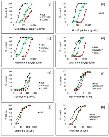 Whole plant dose–response test on three genotypes (RGS: standard sensitive, WW2027: homozygous wild type tryptophan, LL: homozygous mutant leucine and eight different ACCase-inhibiting herbicides: (a) clodinafop-propargyl, (b) fluazifop-P-butyl, (c) haloxyfop-methyl, (d) quizalofop-ethyl, (e) cycloxydim, (f) tepraloxydim, (g) clethodim, and (h) pinoxaden. The values plotted were back-transformed following analysis of logit transformed responses.