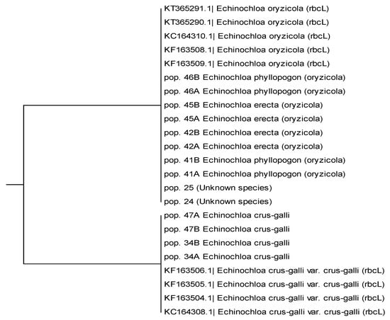 A preliminary analysis using MEGA X® software [21] was performed including several nucleotide sequences of Echinochloa spp. cpDNA (chloroplast DNA) gene rbcL [22,23] reported in GenBank database (www.ncbi.nlm.nih.gov/nucleotide accessed on 10 December 2021) and in the Barcode of Life Data Systems (BOLD, http://www.barcodinglife.org/ accessed on 1 September 2021, vouchered specimens only), as well as some rbcL sequences obtained from Echinochloa purified and classified accessions [24].