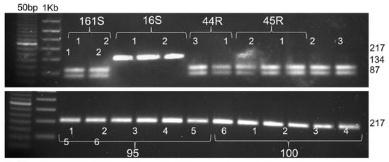 Results of CAPS-rbcL molecular marker for a selection of samples tested: plants belonging to “white” species, E. oryzicola (161S, 44R, 45R and 46R), show the two digested bands at 134 and 87 bp, whereas plants belonging to “red” species, E. crus-galli (16S, 95R and 100R) show a single band.