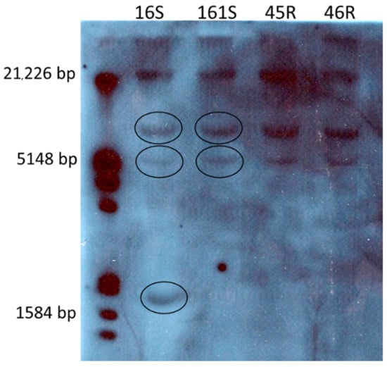 Five, 6-nucleotide-recognizing endonucleases that did not cut the probe sequence were selected to perform Southern blotting analysis on the four Echinochloa populations. Three experiments were conducted: (1) gDNA of populations 16S and 45R was digested with two restriction endonucleases, HindIII (Invitrogen, Waltham, MA, USA) and EcoRV (Invitrogen); (2) gDNA of populations 16S and 45R was digested with three restriction endonucleases, XbaI (Invitrogen), KpnI (Invitrogen) and BamHI (NEB); (3) populations 16S, 161S, 45R and 46R gDNA digestion was repeated with HindIII, to confirm the results obtained in the first two experiments.
