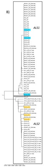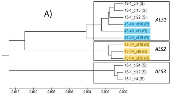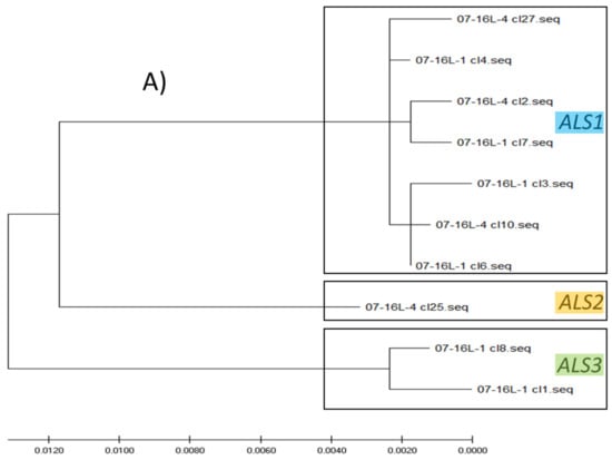 (A) Cladogram obtained from UPMGA estimation of full-length clone sequences, five of the plant 16L-1 and five of the plant 16L-4 (both plants of S E. crus-galli population 16S) using MEGA X®; these clones were used to define the different ALS gene copies in the R populations of the E. crus-galli species; (B) cladogram obtained from UPMGA estimation of 46 ALS partial clone sequences starting from 5′-end belonging the E. crus-galli populations 16S, 95R and 100R, using MEGA X®; the mutated clones of E. crus-galli populations 95R and 100R are highlighted in red; the sequences of population 16S present in the cladogram of (A) are highlighted in blue (ALS1), orange (ALS2) and green (ALS3), respectively, in the cladogram of (B).