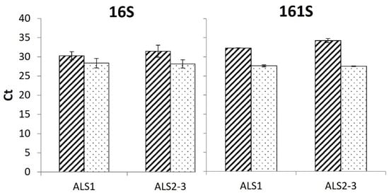 Ct of ALS1 and ALS2-3 amplified on the susceptible populations, 16S and 161S. Hatched bars indicate the mean values of the untreated plants, whereas dotted bars indicate the mean values of the treated plants. Thin bars represent the standard errors.