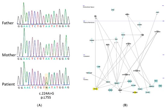 To find out if ZBTB26 shares any common functional links with the known genes involved in primary hypothyroidism (indicated in blue color on Figure 1), Ingenuity pathway analysis was carried out. Network links between ZBTB26, UBE2I, NKX2-1, and PAX8 could be revealed; all reside in the nucleus (Figure 1B). Protein–protein interactions were identified between ZBTB26 and UBE2I, as well as UBE2I and NKX2-1 [], and an interaction between PAX8 and NKX2-1 has been described []. Together, these data highlight a connection between ZBTB26 and several known CH genes (Figure 1B).