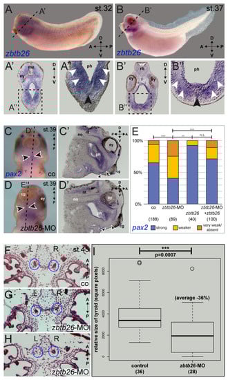 Morpholino-mediated knockdown of zbtb26 in the mesendodermal lineage of 4-cell stage embryos resulted in a strongly reduced thyroid anlage. We then analyzed expression of known Xenopus orthologs of known CH genes: forkhead box E3 (foxe3), hematopoietically expressed homeobox (hhex), NK2 homeobox 1 (nkx2.1), and paired box 2 (pax2), the amphibian functional ortholog of the mammalian Pax8 gene [,,,,,]. Our experimental data show that pax2 was significantly reduced or lost in the ventral thyroid anlagen of zbtb26 morphant embryos (Figure 2C–E), while foxe3, nkx2.1, and hhex expression was left unaltered (Figure S1C), suggesting that zbtb26 displays a regulatory role on pax2.