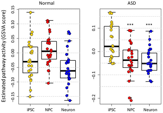 The estimated activity of 23 ASD-associated pathways in normal and ASD samples in three neural cell types, representing different stages of cell development. The pathway activity was assessed based on GSVA scores. In the ASD samples, the differences of GSVA scores between iPSC and NPC (p-value = 7.64 × 10−4), as well as between iPSC and neuron cells (p-value = 7.11 × 10−5) were statistically significant. *** , two-tail Student’s t-test.