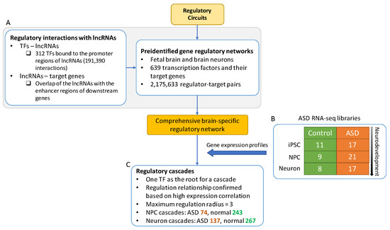 The workflow of generating gene regulatory cascades. The gene regulatory networks of fetal brain and brain neuron tissues were created based on Regulatory Circuits [18] and lncRNAs were incorporated to complete the regulatory networks (A). The gene expression profiles (B) of ASD were overlaid on the network to establish ASD regulatory cascades (C). The root of each regulatory cascade is a TF.