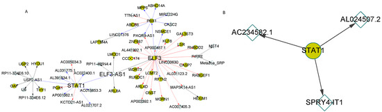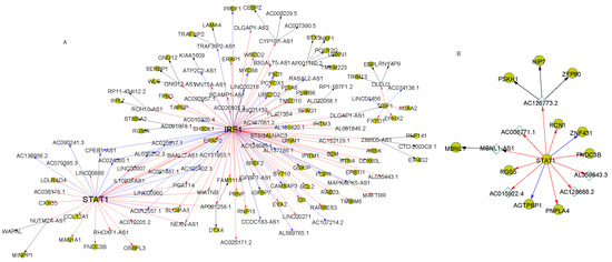 The regulatory cascades with transcription factor STAT1 as the root in the neuron cells. The expression correlation coefficients of connected genes were larger than 0.8 in the cascades. (A) showed the regulatory cascade in the normal samples. (B) represented the cascade with the root gene STAT1 in the ASD samples. The gold circles denoted PCGs and the white diamonds represent lncRNAs. The directed arrows indicate the regulations from the regulators to the target genes with diverse correlation patterns: Positive (red), negative (blue) and lncRNA-target based on enhancer matching (black).