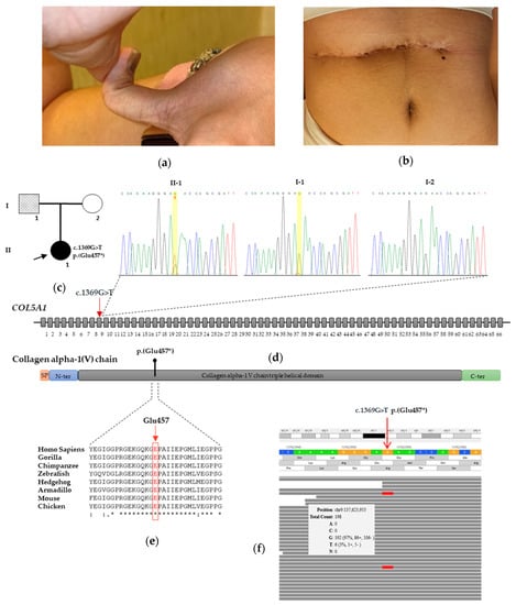 Clinical aspects and molecular findings. (a) Distal phalanx hyperextension of the thumb in the proband. (b) Dystrophic post-surgical scarring formation in the proband. (c) Pedigree of the studied family with parental mosaicism; the affected heterozygous proband is indicated with a filled symbol, and the individual with mosaicism is indicated by a hatched symbol. (d) Electropherogram showing DNA sequencing of the proband carrying c.1369G>T, p.(Glu457*) in exon 9 of COL5A1 and her unaffected parents. In the middle of the panel, there is a schematic representation of the COL5A1 gene that shows the heterozygous c.1369G>T variant. A yellow bar indicates the affected nucleotide. The arrow indicates the germline variant in the proband. The identified variant is also put in a gene and protein context. In the middle, the coding regions are in grey; the black line represents the intron regions that are not to scale. In the lower part is a schematic diagram of the collagen type V alpha-1 chain protein: the signal peptide is in red, and N-terminal and C-terminal propeptide domains are in blue and green, respectively. (e) Alignment of the amino acid sequence of the collagen type V alpha-1 chain region, including the residue p. Glu457 among several species, was generated by Clustal Omega. (f) Genomebrowser view from the Alissa software output. The grey window shows that the COL5A1 c.1369G>T allele is present in 3% of the reads in the father’s blood specimen.