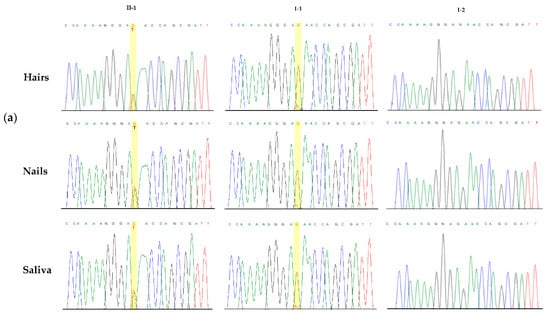 Confirmation of the NGS data concerning the COL5A1 candidate variant was first performed by Sanger sequencing on DNA extracted from the proband’s and her parents’ peripheral blood. Subsequently, Sanger sequencing was also carried out on DNA extracted from proband’s and her father’s hair bulbs, nails and saliva. For Sanger sequencing on DNA extracted from hair bulbs, nails and saliva, the experiment also included a control DNA extracted from the same tissues. The primers were designed by using primer3 tool (https://primer3.ut.ee/, accessed on 26 July 2021) to amplify COL5A1 exon 9, checked by BLAST against the human genome to ensure its specificity (COL5A1_ex9_F: 5′-cctcctcgtctgaaggtgataa-3′, COL5A1_ex9_R: 5′-tgacttttccacaattctctagct-3′). The amplified products were subsequently purified by using ExoSAP-IT PCR Product Cleanup Reagent (Thermo Fisher Scientific, Wilmington, DE, USA) and sequenced by using a BigDye Terminator v1.1 sequencing kit (Thermo Fisher Scientific, Wilmington, DE, USA). The fragments obtained were purified using DyeEx plates (Qiagen, Tübingen, Germany) and resolved on an ABI Prism 3130 Genetic Analyzer (Thermo Fisher Scientific, Wilmington, DE, USA). Sequences were analyzed using Sequencer software (Gene Codes, Ann Arbor, MI, USA). The identified variant was resequenced in independent experiments.