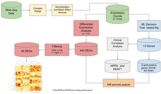 The framework of the integrated analysis. We started from RNA-seq data and performed a complex design drawing, then we normalized and corrected the batch effect. Finally we created a counts table for all 9144 genes. In the blue workflow we applied the ML approach, which led to the selection of two genes: MYH6 and MT-RNR1. A sub-workflow, using a correlation analysis with clinical parameters (grey), led to the selection of NPPA and NEAT1. In the red workflow we used a classic differential expression analysis, which let, from a list of 443 DEGs, to a clusterization based on a list of 48 genes (after filter based on FDR and lgFC applications). A PPI network analysis brought together the results to discover connections.