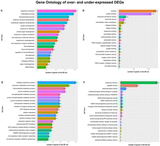 Gene Ontology (GO) analysis was conducted on over- and under-expressed genes using “GOANA” from Limma R package (v3.42.2) [15]. Plots of the first 20 categories by increasing p-value were obtained by ggplot2 (v3.3.0) and were shown in Figure 2C–F. For further details, see Supplementary Materials.