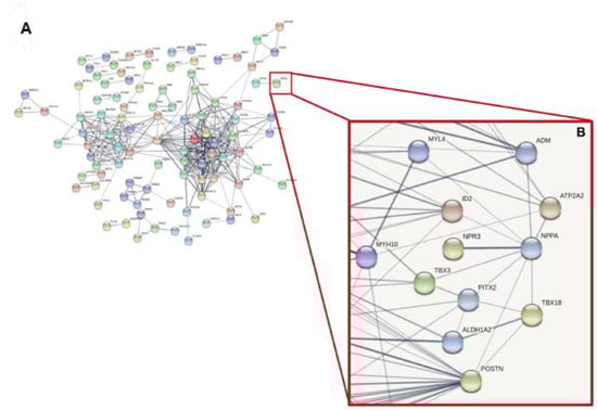 To create a match between bioinformatics and ML results we used the STRING database to perform a PPI network analysis using as input the most significant DEGs (443 genes) and the two protein-coding genes identified by the machine learning approach (NNPA and MYH6). The resulting network contained the subset of proteins that formed physical interactions with at least one other member in the list. Figure 5 underlined the physical interaction of NPPA with NPR3, the atrial natriuretic peptide receptor 3, which regulates blood volume and pressure, pulmonary hypertension, and cardiac function as well as some metabolic and growth processes (score 0.89). In addition, several interesting associations were classified as Textmining interactions. In particular we noticed the ATPase Ca++ Transporting Cardiac Muscle Slow Twitch 2 (ATP2A2) gene, selected by both our bioinformatic and ML approach, was involved in cardiac conduction and Calcium Regulation in the Cardiac Cell (score 0.58); T-Box Transcription Factor 18 (TBX18), transcriptional repressor was involved in developmental processes of a variety of tissues and organs, including the heart and coronary vessels, the ureter, and the vertebral column (score 0.48); Adrenomedullin (ADM) was involved in regulation of the force of heart contraction and in congestive heart failure (score 0.55); Periostin (POSTN),which encodes a secreted extracellular matrix protein that functions in tissue development and regeneration, including wound healing, and ventricular remodeling following myocardial infarction and associated with myocardial infarction (score 0.41); and Paired Like Homeodomain 2 (PITX2), which plays a critical role in the intermediate steps controlling left–right asymmetry, cardiac morphogenesis, and embryonic rotation (score 0.46). Data obtained was validated by qRT-PCR (Figure 6).