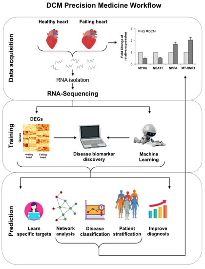 In this study, the challenge was to identify targets that could significantly discriminate pathological from healthy groups. For this purpose, we used rare samples from transplanted myocardial tissues. The preclinical diagnosis of DCM could substantially reduce morbidity and mortality, allowing an early use of cardio-protective therapy. In order to identify the pivotal targets, we performed an RNA-seq on myocardial tissues collected from both HF patients and healthy donors, during organ transplant. The use of ML-based methods, improved the identification of functional genes through the construction of a gene regulatory network [11,12]. In this perspective, in order to realize an automated diagnostic method that can allow a translational approach for precision medicine, we show the advantages of a ML approach to discover the non-naive expression relationships that lead to DCM. Aware of the potential applications of ML-based biomarker panels in the precision medicine, we took up the challenge of centering our approach on explainable ML algorithms. The two approaches allowed the highlighting of a selected group of genes and gene regulators, such as some protein-coding genes, a mitochondrial gene, and a lncRNA, which could facilitate the identification of new therapeutic strategies and provide clinicians with an interesting calculation tool capable of distinguishing a functionally damaged heart from a healthy one. A comprehensive graphical description of all frameworks is shown in Figure 1.