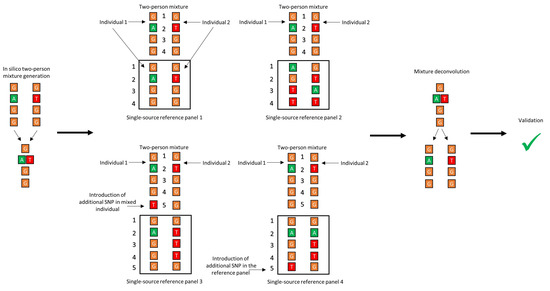 - Panel 2: Using a hold-out cross validation (CV) approach [67,68], namely the hold-two-out CV, this panel was made by leaving out the two haplotypes that were used to create the mixture during each round of deconvolution. The hold-out CV allows validation of the performance of the core algorithm, as well as mimicking of real-world forensic data, whereby haplotype information for both donors is unlikely to be included in the reference database.