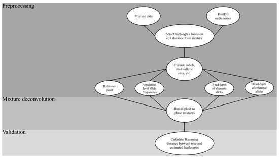 Given that experimental phasing (laboratory-based) methodologies are generally more cumbersome and expensive [39,42,43], a host of statistical phasing (computation-based) software are currently available (e.g., PHASE [41], SHAPEIT [44], BEAGLE [40], IMPUTE2 [45]). In general, these programs depend on linkage disequilibrium (LD) information within the data and occasionally on a reference panel (i.e., database of haplotypes that is used as a reference in order to increase phasing accuracy) [39,40,42,46,47]. However, all of these methods are designed for (single-source) diploid data, and therefore are not suitable for mtDNA mixture deconvolution. This is primarily because, unlike genotypes consisting of diploid DNA, haploid mixtures can be polygenomic (i.e., comprise of haplotypes of more than two individuals) and the genetic material of each contributor can be present in varying proportions [48].