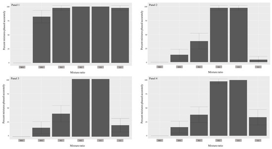 As anticipated, reference panel 1 resulted in the highest deconvolution accuracy across all mixture ratios (except the 50:1) compared to other panels (Figure 3). Simulations with panel 3 had deconvolution accuracies that were subequal to panels 2 and 4 in all ratios except for 1:1, where it significantly outperformed them (40% vs. 2% and 20%, respectively). In the context of estimating the major haplotype, all reference panels led to entirely accurate estimations for all ratios, with the exception of the 1:1 mixtures (in the case of 1:1, contributor 1; Table 1). For the 1:1 mixtures, the highest accuracy was observed in reference panel 1 (97.8%), while the poorest was in reference panel 2 (4.4%). In regards to the minor haplotype, reference panel 1 led to the most accurate overall phasing, with 100% accuracy for ratios 4:1 and 2:1 and slightly lower accuracy for 19:1(82.2%), 9:1 (97.8%), and 1:1 (97.8%; in this case, contributor 2). This performance was followed by reference panel 3, which resulted in 100% accuracy for the same ratios as panel 1 but drastically lower percentage of accurate phasing for ratios 19:1 (15.5%), 9:1 (40%), and 1:1 (20%). Reference panels 2 and 4 had the lowest minor haplotype estimation accuracies, with panel 4 resulting in 100% accuracy for only ratio 2:1 and panel 2 with no ratios estimated accurately. Overall, all reference panels performed better in the 4:1 and 2:1 mixture ratios, while struggling the most with the 50:1 and 1:1 ratios. Two-tailed, two-sample Z-tests for the equality of proportions showed statistically significant differences between the phasing accuracy levels resulting from the 1:1 ratios for all panel files for the estimation of both haplotypes (Table 2). The same test did not yield significant differences between proportions for the remaining mixture ratios, with one possible explanation being the small sample sizes.