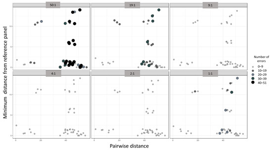 The smallest Hamming distance between individuals in our dataset was 1.0 and the largest was 56.0, with the average being 38.6 (Table S2). The smallest, largest, and average minimum Hamming distances between mixtures and the reference panel were 1.0, 39.0, and 9.7, respectively. The phasing accuracy appeared to be proportional to the pairwise distances in the mixture and inversely proportional to the minimum distance from the reference panel (Figure 4). Linear regression analyses only indicated a statistically significant relationship between the minimum distance from the panel file and the number of phasing errors (p-value 6.64 × 10−4, Table 3). Overall, the minimum distance from the panel had the largest influence on the 50:1 and 1:1 mixtures and no influence on the 4:1 and 2:1 mixture ratios.