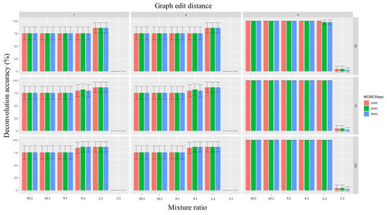 No appreciable change was associated with the adjustment in the read depth or the number of steps within the context of a graph edit distance of 4. Here, for read depths of 50×, 75×, and 100× and numbers of MCMC steps of 3000, 6000, and 9000, the deconvolution accuracy was 100% for all ratios expect for the 1:1 ratio. The 1:1 mixtures had estimation accuracy values of 4.4% for 3000 and 6000 MCMC steps and 2.2% for 9000 steps for all three read depths (Figure 5).