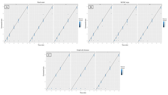 Scatter plots depicting estimated mixture ratios (x axis) against their predicted values (y axis) for six different ratios as they related to each tested parameter, namely read count (A), number of MCMC steps (B), and the graph edit distance (C). Each subplot represents a specific value for the chosen parameter, namely 50, 75, and 100 for (A), 3000, 6000, and 9000 for (B), and 1, 2, and 4 for (C). The color represents pairwise distances, ranging from 10–50, between haplotypes in each mixture.