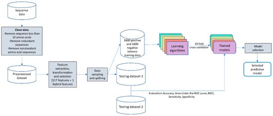 The contributions of this research are as follows: (1) To the best of our knowledge, we collected the largest AMP dataset from 15 public databases, in contrast to previous works that used one to two databases, such as the CAMP and/or APD database. As AMPs are highly heterogeneous, different subtypes of AMPs exist; therefore, we performed proportionate stratified random sampling by partitioning into homogeneous strata based on clustering. Representative sequences were selected from each cluster for using as training data. (2) We collected and employed as many features as possible. Sequence features are important for the antimicrobial activity and in vivo stability of AMPs. Such sequence features also contribute to AMP prediction. Different AMP predictors use different sets of features. For a state-of-the-art deep learning approach, the algorithm automatically extracts features (in the form of a matrix of the weight numbers from deep neural nets). Thus, the deep learning method does not possess a feature engineering step. In our method, feature extraction and selection were conducted. The features are relatively more explainable in terms of biological meanings. We attempted to capture some explainable relationship in the features, which may provide an advantage in AMP sequence design in the future. (3) We include the process of feature engineering, i.e., modeling, to describe or capture relationships between interpretable features to create the hybrid feature. Moreover, we expect that this type of information will be helpful in exploring or designing AMPs sequence in the future. Moreover, we plan to explore this type of feature in greater detail. (4) We investigated various types of machine learning technique for building predictors, including both single and ensemble techniques.