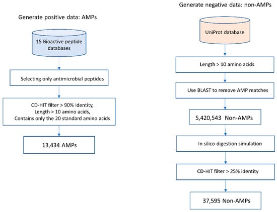 Table 2. Public bioactive databases. - Currently, there is no database of experimentally verified non-AMP available. Therefore, we build negative data using the approach described in [13,16]. Negative data or non-AMP data were collected from the UniProt [26] database (February 2020) by choosing only proteins that do not contain functional information related to antimicrobial activity and do not have a secretory signal peptide position. The basic local alignment search tool (BLAST) was used to filter out AMP matches. Peptide sequences with lengths <10 amino acids were discarded. Then, the in silico enzymatic digestion simulation [27] was performed to digest polypeptides into digested peptide sequences. Then, the CD-HIT program [24] was used to remove peptide sequences with >25% identity. Therefore, a total of 37,595 peptides were designated as negative sequence data.