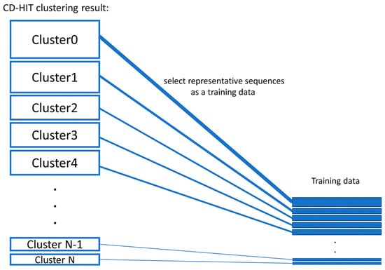- Balanced training data were created by proportionate stratified random sampling to select peptide sequences to represent the positive and negative data. The stratified sampling was conducted by similarity clustering of sequence data into homogenous strata based on the CD-HIT clustering tool. The proportional stratified random sampling was performed with the following steps. (i) The sequences were clustered by using CD-HIT with a similarity threshold of 0.3. (ii) Representative sequences were selected from each cluster to use as training data, while the other remaining sequences that were not representative of the cluster will be used as testing data (results are shown in Supplementary File S1 the representative sequences are denoted with the * symbol at the end of the line; the non-representative sequences are displayed with the percentage of sequence similarity to the representative sequence of that cluster). We balanced the number of representative sequences based on the cluster size, as shown in Figure 3. Note that there is no testing sequence presented in the cluster with one sequence member. For some clusters that contain only 1 sequence, the sequence in that cluster will be used as a training set, and the testing sequence is not presented in that cluster. A summary of the sequence similarities between training and testing sequences in all clusters is presented in Supplementary File S2. The sequence similarity between training and testing sequences falls between 30% and 89.47%, with an average of 47.29%. Finally, the training data consists of 1800 peptide sequences of the AMP dataset and 1800 sequences of the non-AMP dataset to make an evenly balanced training dataset in order to reduce the likelihood of generating a predictive model biased toward the majority class.