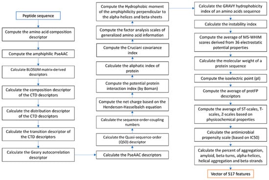 Various numerical representation schemes of proteins and peptides from amino acid sequences of both AMP and non-AMP datasets were generated. Feature extraction of peptide characteristics that would be useful in predicting, namely, the amino acid composition, pseudo amino acid composition (PseAAC) in parallel and in series correlation, and the details of the secondary structure conformation, composition–transition–distribution (CTD), various physical–chemical properties, antimicrobial propensity scale (antimicrobial IC50 index derived from high-throughput values of different amino acids), and the percentage of different conformations in the peptide sequence were calculated using the protr R package [44,45], peptide R package [45], AMPA program [3,46], Tango program [47], and Pse-in-one program [48,49]. Various modes of Chou’s PseAAC descriptors were generated. Chou’s PseAAC has been widely used to convert complicated protein sequences with various lengths to fixed-length digital feature vectors while keeping considerable sequence-order information. [50]. Chou’s PseAAC can represent a protein sequence in a discrete model without completely losing its sequence-order information and hence has been widely applied for improving the prediction quality for various protein problems [51,52]. The description of features is described in Supplementary Table S3 (in Supplementary File S3). These feature characteristics are stored in the form of a vector of peptide data characteristics that consists of 517 numerical features. The flowchart of feature extraction of peptide data characteristics follows the steps shown in Figure 4.