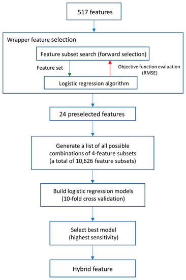 To improve the prediction with informative features, we proposed a hybrid feature generation by the fusion of various selected features using a logistic regression model. Logistic regression models were built by following the steps shown in Figure 5. Beginning with the preselection of features by using the wrapper feature selection method, feature subsets that specifically suit the logistic regression model were selected. The root-mean-square error (RMSE) and forward search method were performed in the wrapper method, providing 24 features that are most informative for the logistic regression model. To reduce the complexity of hybrid features and avoid the overfitting issues of the models, we used 4 features for creating a composite feature. A combination of 4 randomly selected features out of 24 preselected features generated a total of 10,626 sets of composite features. Next, logistic regression models were built using 10,626 sets of features for a total of 10,626 equations. Then, the performances of the logistic regression models were compared. The logistic regression model with the highest sensitivity would be selected for further study as a hybrid feature. The hybrid feature is defined as the following equation: