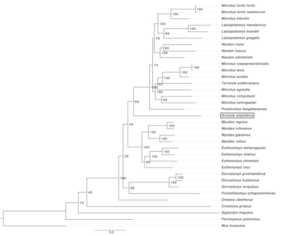 2.2. Arvicolinae: Phylogenetic Analysis of Mitochondrial Genomes