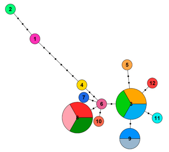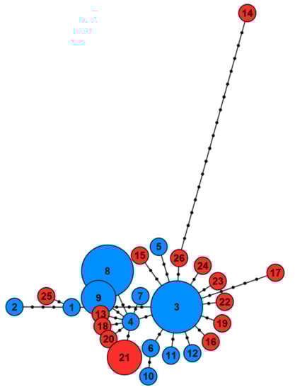 2.4. Arvicola amphibius: Haplotype Networks and Phylogenetic Analysis